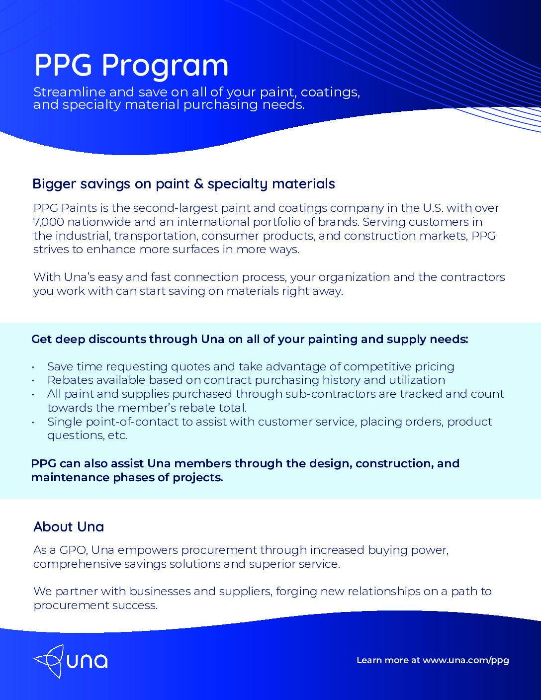 Una’s contract with PPG provides competitive pricing on a vast portfolio of products, opportunities to receive additional rebates on purchases, credit for purchases made through sub-contractors, and a single point-of-contact for customer support.